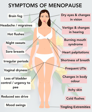 - Symptoms: hot flushes, sleep problems, mood changes, heavy/irregular periods, pain, brain fog.