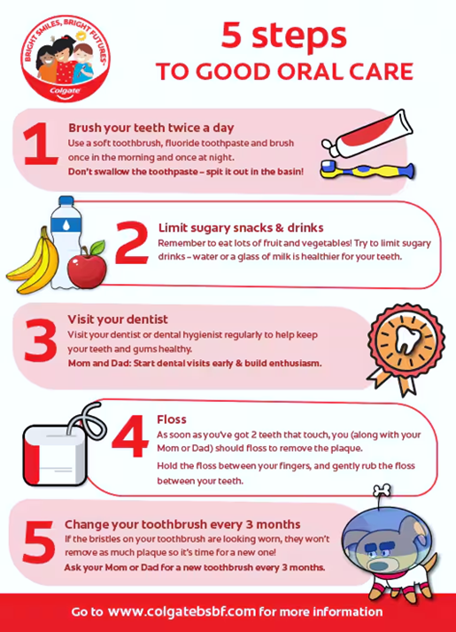 - Encourage small steps: twice-daily brushing, reducing sugary snacks/drinks.